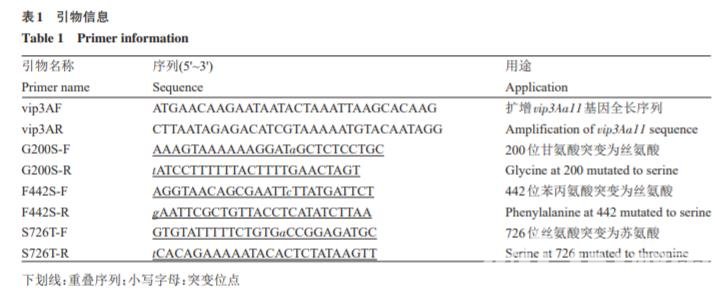根據(jù) vip3Aa11 基因(GenBank No. AAR36859) 全長(zhǎng)序列,通過(guò) DNAMan 7.0 設(shè)計(jì)定點(diǎn)突變引物, 引物設(shè)計(jì)包含5'端重疊區(qū)和3'端延伸區(qū);除突變位 點(diǎn)外,引物長(zhǎng)度大約25~30 bp,5'端重疊區(qū)包含15~ 20 bp,3'端延伸區(qū)包含至少10 bp?突變位點(diǎn)位于2 條引物上,分別位于正向突變引物重疊區(qū)下游?緊 鄰重疊區(qū)和反向突變引物 5'端?引物由上海生工 生物工程技術(shù)服務(wù)有限公司合成。