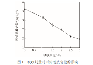 輻照消解油炸土豆片中丙烯酰胺是利用 60Co 衰 變產(chǎn)生的 γ 射線處理淀粉類熱加工食品,通過輻照過 程中基質(zhì)水分產(chǎn)生的自由基誘導(dǎo)丙烯酰胺發(fā)生聚合 反應(yīng)生成無毒的聚合物,從而達(dá)到消除基質(zhì)中已生成 丙烯酰胺的目的。吸收劑量和基質(zhì)含水量對丙烯酰胺 的輻照消解效應(yīng)影響較為顯著,Na2CO3、異抗壞血酸 鈉、芝麻酚可促進(jìn)丙烯酰胺的輻照消解,添加芝麻酚 后丙烯酰胺的消解率最高為 60.49%。此研究從增加 丙烯酰胺分子量的角度考慮,使用較為成熟的輻照技 術(shù)聚合消除已生成的丙烯酰胺,不僅對食品風(fēng)味無影 響且成本較低,是對淀粉類熱加工食品中丙烯酰胺控 制方法體系的補(bǔ)充,可為淀粉類農(nóng)產(chǎn)品熱加工后控制 丙烯酰胺的含量提供理論基礎(chǔ)。