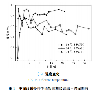 圖 1 為面板復合材料試樣在不同吸濕環(huán)境中 的吸濕率 - 時間曲線。從圖中可見,五種吸濕環(huán) 境中,面板復合材料的大部分吸濕都集中在吸濕 初期的 24 h 內,即吸濕初期吸濕率快速增加,隨 后吸濕率有所波動,最終都到達平衡。不同濕度 環(huán)境中( 見圖 1( a) ) ,面板復合材料的吸濕行為 相差很大,環(huán)境的濕度越大,試樣的吸濕速率和飽 和吸濕率也越大,85% RH、95% RH 和浸水三種濕 度下面板的飽和吸濕率分別為 0. 57% 、1. 18% 、 2. 36% 。同時發(fā)現(xiàn),在高濕度環(huán)境 85% RH、95% RH 中,面板復合材料的吸濕率波動較小,而浸水 環(huán)境中面板復合材料的吸濕率有明顯的下降,這 是由于浸水環(huán)境更為惡劣,浸水對面板復合材料 的損傷更大,使試樣表面溶解和剝落等質量損失 的程度和范圍大于高濕度環(huán)境,且面板復合材料 本身質量較小,在吸濕率曲線上表現(xiàn)為吸濕率顯 著下降。不同溫度環(huán)境中( 見圖 1 ( b) ) ,面板復 合材料的吸濕率曲線更加相近,吸濕速率沒有明 顯的規(guī)律,吸濕后期都有部分波動,其中 70 ℃ 時 面板復合材料的吸濕率下降最多,其次為 60 ℃環(huán) 境下的,50 ℃ 環(huán)境下試樣的吸濕率穩(wěn)定上升,沒 有明顯的下降過程。這可能是因為環(huán)境溫度越 高,吸濕過程中材料的剝離、脫粘等不可逆損失越 多。最終50 ℃、60 ℃、70 ℃三種環(huán)境中面板復合 材料 的 飽 和 吸 濕 率分別為 0. 85% 、0. 57% 、 0. 51% ,三個飽和吸濕率較為接近。與環(huán)境溫度 相比,濕度對面板復合材料吸濕行為的影響更大。