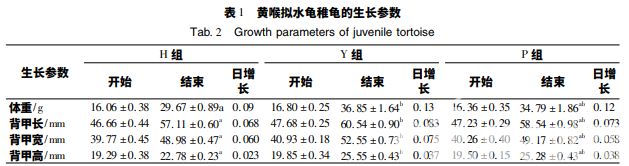 由表 1 可知,經 154 d 試驗,各組稚龜的平均日增重: P 組為 0. 12 g,與 Y 組的 0. 13 g 很接近, 而比 H 組的 0. 09 g 大. 稚龜的生長速度表現為 Y 組最快,P 組次之,H 組最慢. 經方差檢驗,P 組 與 Y 組的生長差異不顯著,其他項的差異程度詳見表 1.