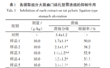 用藥效結(jié)果 各提取組分對(duì)大鼠幽門結(jié)扎型胃潰瘍的抑制 作用藥效試驗(yàn)結(jié)果用t值法進(jìn)行統(tǒng)計(jì)分析,結(jié)果見(jiàn) 表1。