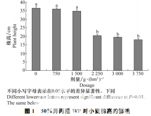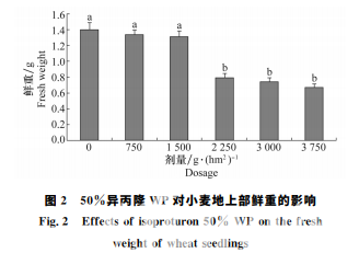 藥 后 5d目 測 觀 察,50% 異 丙 隆 WP750~ 3750g/hm2 處理區小麥生長正常,株高、葉色等指標 與清水對照處理相比沒有明顯差異。隨著時間的推 移,藥后10d調查時,50%異丙隆 WP750、1500g/hm2 處理區小 麥 生 長 正 常,未 見 異 常,但 2250、3000、 3750g/hm2 處理區小麥葉片發黃,植株明顯矮化, 小麥的株高和地上部鮮重比清水對照處理分別下降 了43.96%、46.70%、50.55%和43.57%、47.14%、 52.14%,藥害明顯(圖1~2)。
