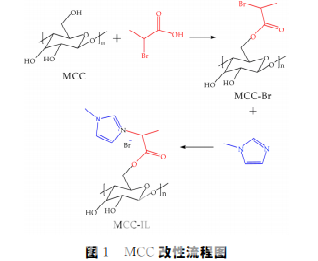 將15mL1-甲基咪唑和1.00gMCC-Br加入 80mL乙醇中,70 ℃水浴恒溫?cái)嚢璺磻?yīng)24h后, 將粗產(chǎn)物用無(wú)水乙醇洗滌,將所得產(chǎn)物用離心機(jī)以 3000r/min的速度離心3min.之后置于60 ℃真 空干燥箱內(nèi)干 燥12h,最終得到離子液體改性微 晶纖維素(MCC-IL).